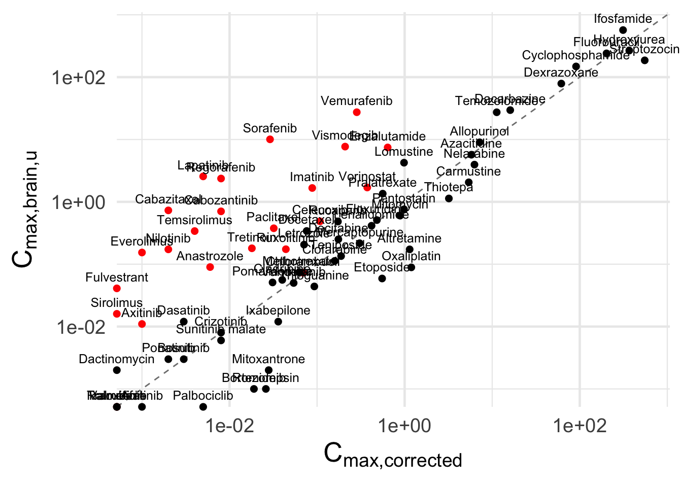 # Prepare data with color based on kp_uu_brainplot_df <- merged_df %>%filter(!drug_name %in%c("Busulfan", "Carboplatin", "Cisplatin", "Exemestane")) %>%mutate(dot_color =ifelse(kp_uu_brain >3, "red", "black"),label = drug_name )# Make the scatterplotscatter_plot_concentrations <-ggplot(plot_df, aes(x = unbound_brain_cmax_micromolar_emc,y = unbound_brain_cmax_micromolar_kp)) +# Add 1:1 diagonal linegeom_abline(slope =1, intercept =0, linetype ="dashed", color ="gray50") +# Add points with color depending on kp_uu_braingeom_point(aes(color = dot_color), size =2) +# Optional: Add labelsgeom_text(aes(label = label), vjust =-0.8, size =3.3) +# Manual color scalescale_color_identity() +coord_cartesian(clip ="off") +# Log10 scales for both axesscale_x_log10() +scale_y_log10() +labs(x =expression(C[max*","*plain("corrected")]),y =expression(C[max*","*plain("brain")*","*plain("u")]) ) +theme_minimal(base_size =18) +theme(axis.title.x =element_text(size =20),axis.title.y =element_text(size =20) )# Show the plotprint(scatter_plot_concentrations)