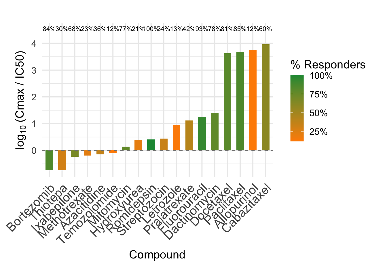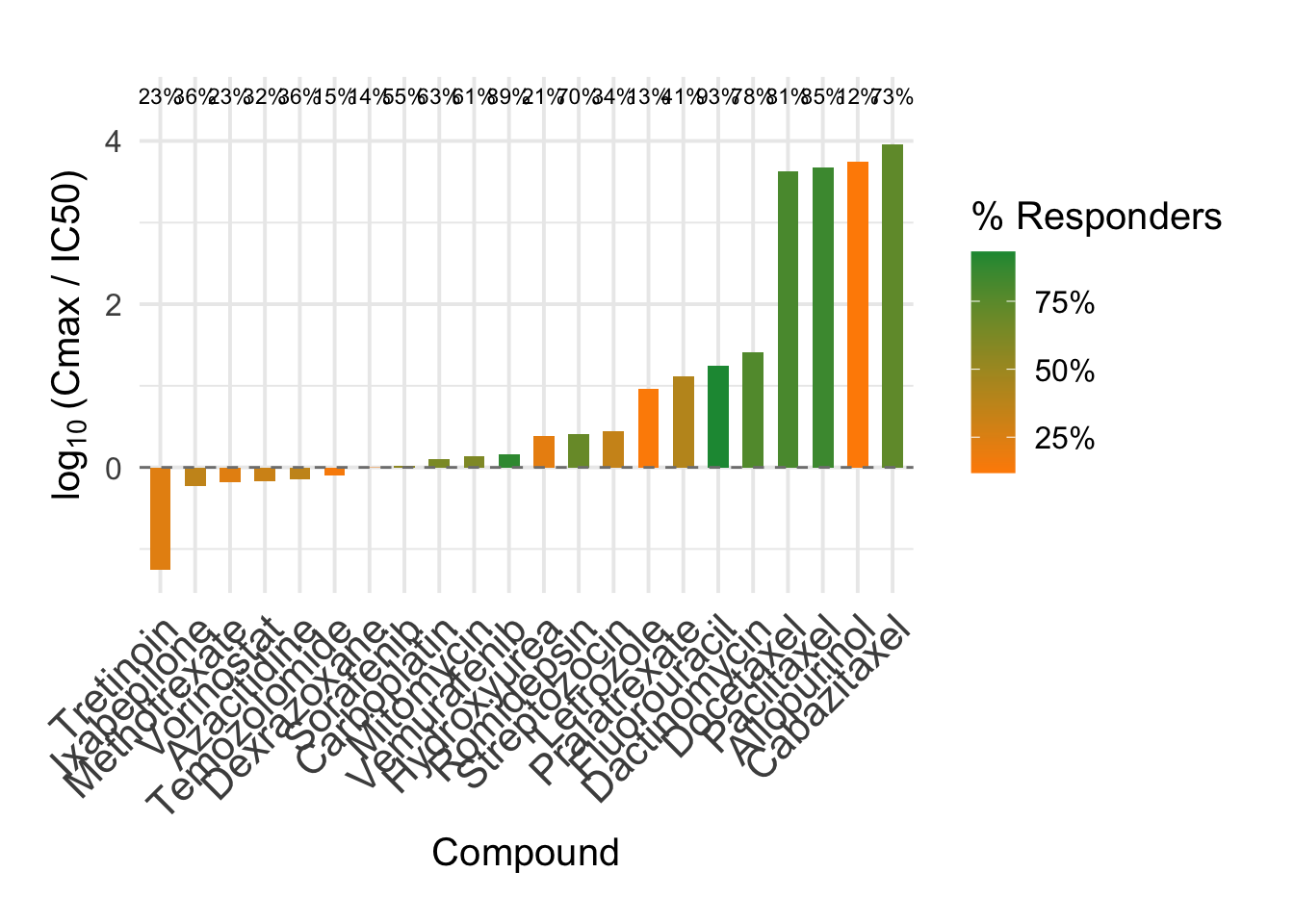 # Prepare the datapromising_df <- merged_df %>% dplyr::filter(responders_emc >0.1) %>% dplyr::mutate(drug_name =reorder(drug_name, log10(cmax_IC50_kp)),responders_emc_label = scales::percent(responders_emc, accuracy =1),valid_IC50_label = scales::percent(valid_IC50, accuracy =1) )# Compute label positionsy_label_pos <-max(log10(promising_df$cmax_IC50_kp), na.rm =TRUE) +0.5y_lim <- y_label_pos +1.2x_label_pos <-nrow(promising_df) -1+0.5exposure_plot_emc <-ggplot(promising_df, aes(x = drug_name)) +# Vertical barsgeom_col(aes(y =log10(cmax_IC50_kp), fill = responders_emc), width =0.6) +# Dashed line at exposure = IC50geom_hline(yintercept =0, linetype ="dashed", color ="gray50") +# responders_emc % text above each bargeom_text(aes(y = y_label_pos, label = responders_emc_label),vjust =0, size =3 ) +# Fill color scale for % responders_emcscale_fill_gradient(low ="#ff8c00", high ="#1a9641", name ="% Responders",labels = scales::percent_format(accuracy =1) ) +labs(x ="Compound",y =expression(log[10]~"(Cmax / IC50)") ) +theme_minimal(base_size =15) +theme(axis.text.x =element_text(size =16, angle =45, hjust =1),legend.position ="right",plot.margin =margin(t =30, r =20, b =20, l =20) ) +ylim(min(log10(promising_df$cmax_IC50_kp), na.rm =TRUE), 4.5)exposure_plot_emc