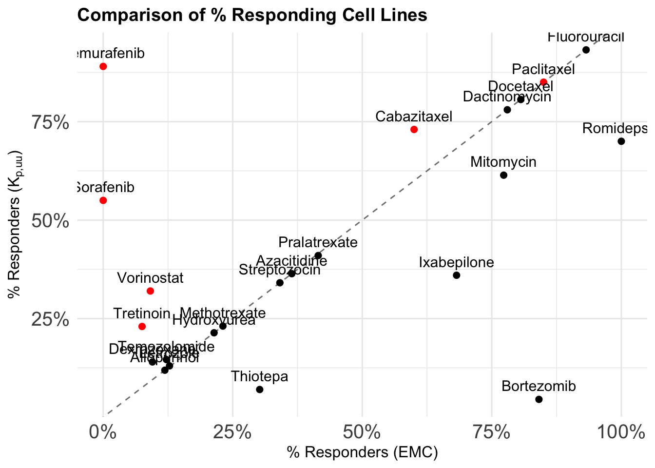 # Prepare the dataplot_df <- merged_df %>%filter(responders_emc >0.1| responders_kp >0.1) %>%mutate(dot_color =ifelse(kp_uu_brain >3, "red", "black"),label = drug_name )# Make the scatter plotscatter_plot_responders <-ggplot(plot_df, aes(x = responders_emc,y = responders_kp)) +# Add 1:1 diagonal linegeom_abline(slope =1, intercept =0, linetype ="dashed", color ="gray50") +# Add points with custom coloringgeom_point(aes(color = dot_color), size =2) +# Optional: Add labelsgeom_text(aes(label = label), vjust =-0.8, size =4) +# Manual color scale (red = high kp_uu_brain)scale_color_identity() +# Format % axesscale_x_continuous(labels =percent_format(accuracy =1)) +scale_y_continuous(labels =percent_format(accuracy =1)) +# Labels and themelabs(title ="Comparison of % Responding Cell Lines",x ="% Responders (EMC)",y =expression("% Responders ("*K[p*","*plain("uu")]*")") ) +theme_minimal(base_size =12) +theme(plot.title =element_text(face ="bold", size =14),axis.text =element_text(size =15) )# Show the plotprint(scatter_plot_responders)