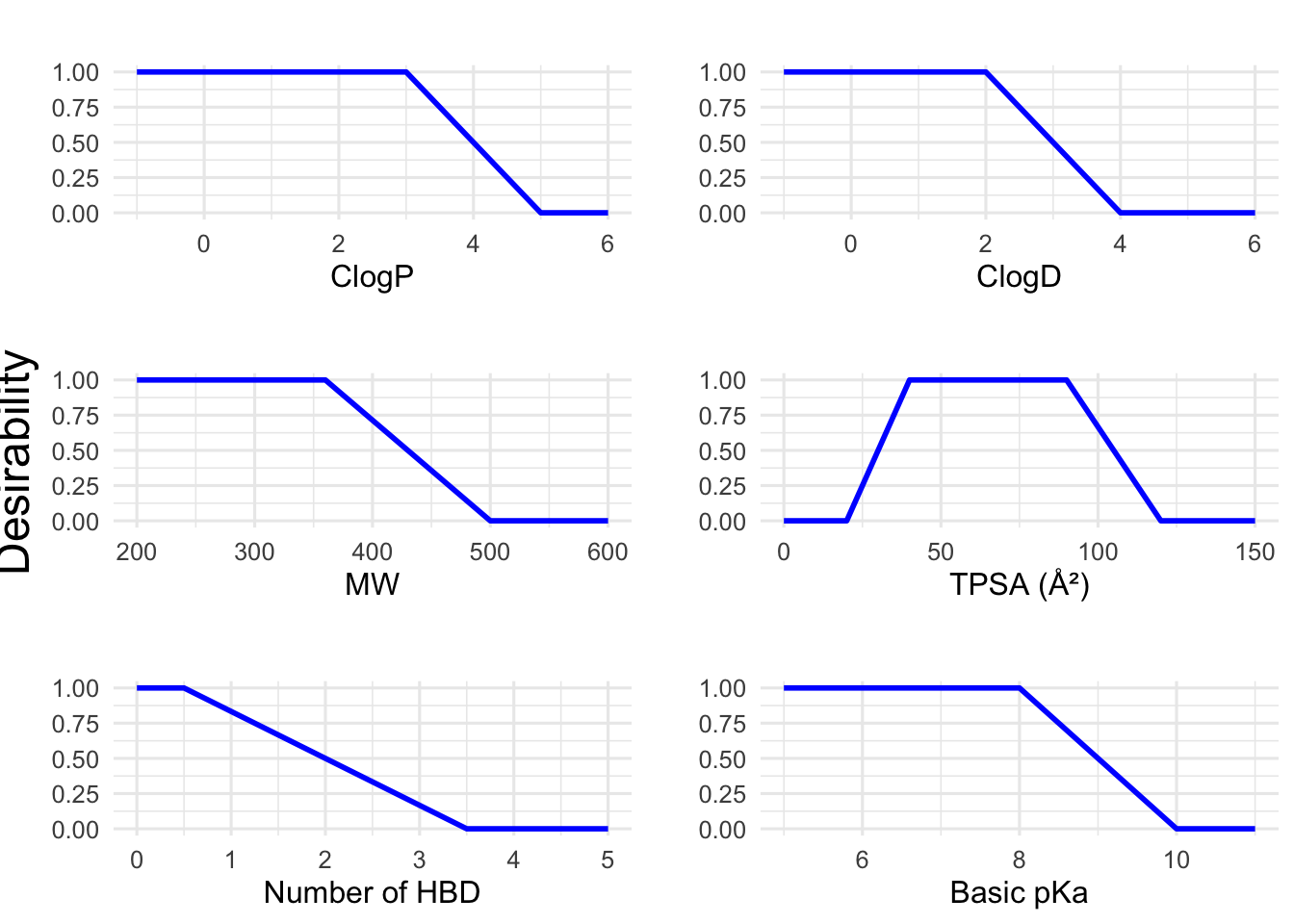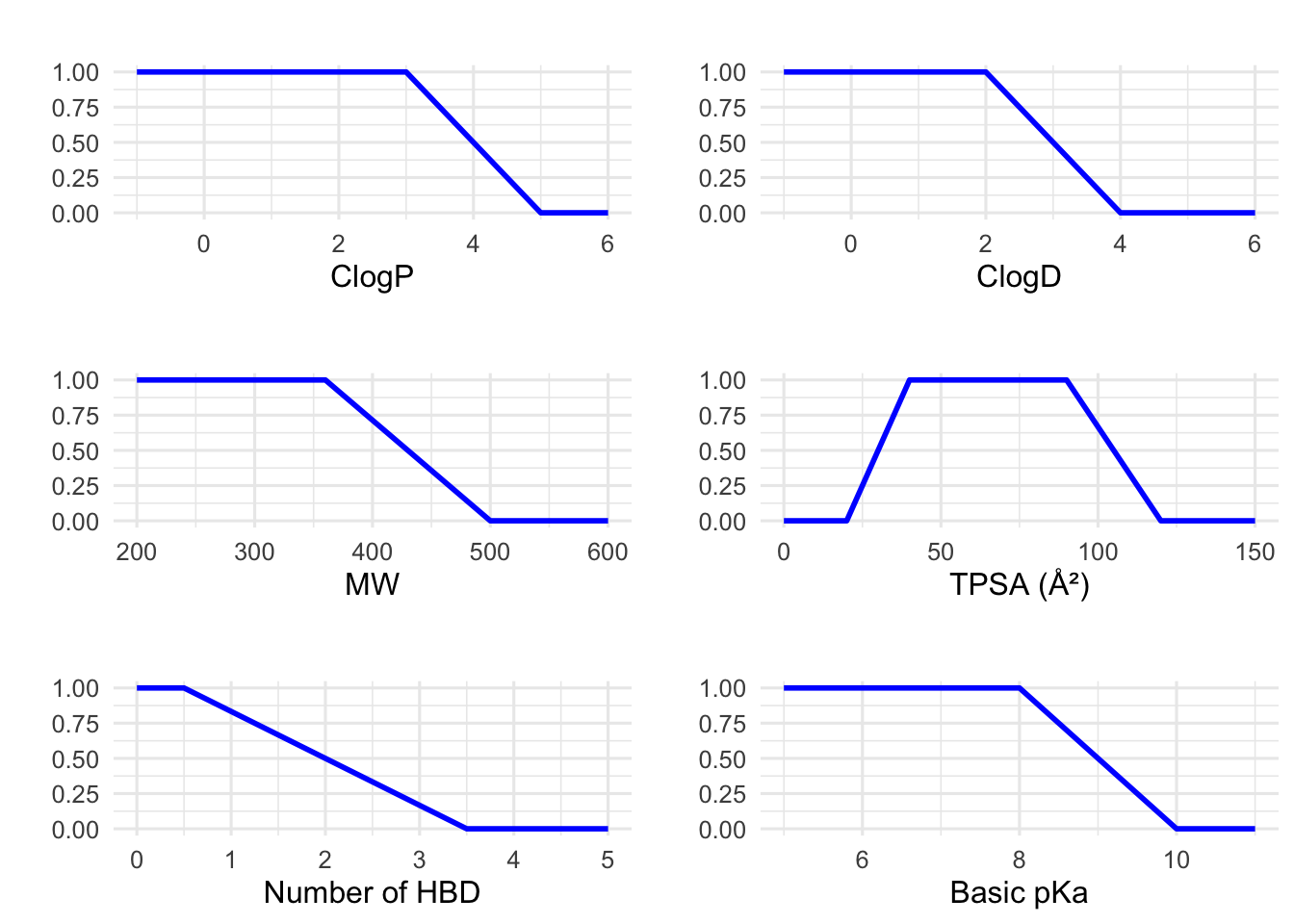 # -----------------------------# Define transformation functions# -----------------------------# For properties with a monotonic-decreasing transformation:monotonic_decreasing <-function(x, ideal, cutoff) {# x: numeric vector of property values# ideal: values <= ideal get a score of 1# cutoff: values >= cutoff get a score of 0 y <-rep(NA, length(x)) y[x <= ideal] <-1 y[x >= cutoff] <-0 middle <- (x > ideal) & (x < cutoff) y[middle] <- (cutoff - x[middle]) / (cutoff - ideal)return(y)}# For TPSA, which follows a hump function:hump_function_TPSA <-function(x, lower_cutoff, lower_ideal, upper_ideal, upper_cutoff) {# Returns 0 if x <= lower_cutoff or x >= upper_cutoff.# Returns 1 if x is between lower_ideal and upper_ideal.# And linearly interpolates between lower_cutoff->lower_ideal and upper_ideal->upper_cutoff. y <-rep(NA, length(x)) y[x <= lower_cutoff | x >= upper_cutoff] <-0 lower_region <- (x > lower_cutoff) & (x < lower_ideal) y[lower_region] <- (x[lower_region] - lower_cutoff) / (lower_ideal - lower_cutoff) ideal_region <- (x >= lower_ideal) & (x <= upper_ideal) y[ideal_region] <-1 upper_region <- (x > upper_ideal) & (x < upper_cutoff) y[upper_region] <- (upper_cutoff - x[upper_region]) / (upper_cutoff - upper_ideal)return(y)}# -----------------------------# Create data frames for each parameter with appropriate ranges:# -----------------------------# 1. ClogP: Ideal ≤3, cutoff ≥5.df_clogP <-data.frame(x =seq(-1, 6, by =0.1))df_clogP$desirability <-monotonic_decreasing(df_clogP$x, ideal =3, cutoff =5)# 2. ClogD: Ideal ≤2, cutoff ≥4.df_clogD <-data.frame(x =seq(-1, 6, by =0.1))df_clogD$desirability <-monotonic_decreasing(df_clogD$x, ideal =2, cutoff =4)# 3. Molecular Weight (MW): Ideal ≤360, cutoff ≥500.df_MW <-data.frame(x =seq(200, 600, by =5))df_MW$desirability <-monotonic_decreasing(df_MW$x, ideal =360, cutoff =500)# 4. TPSA: Hump function with lower cutoff 20, lower ideal 40, upper ideal 90, upper cutoff 120.df_TPSA <-data.frame(x =seq(0, 150, by =1))df_TPSA$desirability <-hump_function_TPSA(df_TPSA$x, lower_cutoff =20, lower_ideal =40, upper_ideal =90, upper_cutoff =120)# 5. HBD: Ideal ≤0.5, cutoff ≥3.5.df_HBD <-data.frame(x =seq(0, 5, by =0.1))df_HBD$desirability <-monotonic_decreasing(df_HBD$x, ideal =0.5, cutoff =3.5)# 6. Basic pKa: Ideal ≤8, cutoff ≥10.df_pKa <-data.frame(x =seq(5, 11, by =0.1))df_pKa$desirability <-monotonic_decreasing(df_pKa$x, ideal =8, cutoff =10)# -----------------------------# Generate plots using ggplot2:# -----------------------------p_clogP <-ggplot(df_clogP, aes(x = x, y = desirability)) +geom_line(size =1, color ="blue") +labs(title ="", x ="ClogP", y ="") +theme_minimal(base_size =12)p_clogD <-ggplot(df_clogD, aes(x = x, y = desirability)) +geom_line(size =1, color ="blue") +labs(title ="", x ="ClogD", y ="") +theme_minimal(base_size =12)p_MW <-ggplot(df_MW, aes(x = x, y = desirability)) +geom_line(size =1, color ="blue") +labs(title ="", x ="MW", y ="") +theme_minimal(base_size =12)p_TPSA <-ggplot(df_TPSA, aes(x = x, y = desirability)) +geom_line(size =1, color ="blue") +labs(title ="", x ="TPSA (Ų)", y ="") +theme_minimal(base_size =12)p_HBD <-ggplot(df_HBD, aes(x = x, y = desirability)) +geom_line(size =1, color ="blue") +labs(title ="", x ="Number of HBD", y ="") +theme_minimal(base_size =12)p_pKa <-ggplot(df_pKa, aes(x = x, y = desirability)) +geom_line(size =1, color ="blue") +labs(title ="", x ="Basic pKa", y ="") +theme_minimal(base_size =12)# -----------------------------# Arrange all plots in a grid# -----------------------------desirability_plot <-grid.arrange(p_clogP, p_clogD, p_MW, p_TPSA, p_HBD, p_pKa, ncol =2)