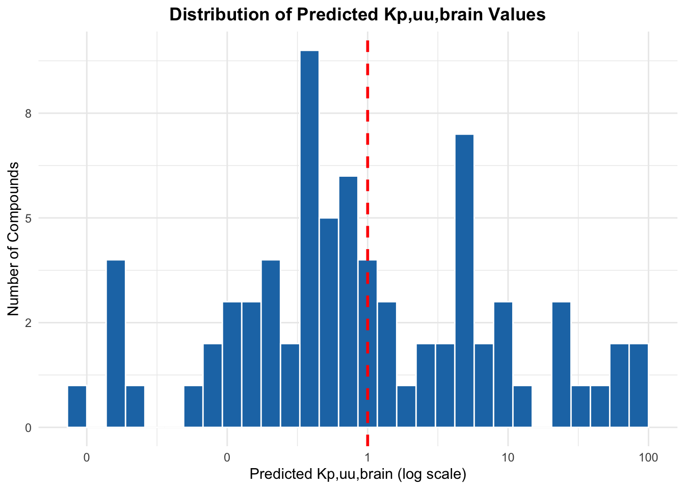 kp_distr <-ggplot(liston_compounds_exposure, aes(x = kp_uu_brain)) +geom_histogram(bins =30, fill ="#1f77b4", color ="white") +scale_x_log10(labels = scales::label_number(accuracy =1)) +scale_y_continuous(labels = scales::label_number(accuracy =1)) +geom_vline(xintercept =1, linetype ="dashed", color ="red", size =1) +labs(title ="Distribution of Predicted Kp,uu,brain Values",x ="Predicted Kp,uu,brain (log scale)",y ="Number of Compounds" ) +theme_minimal() +theme(plot.title =element_text(hjust =0.5, face ="bold") )print(kp_distr)