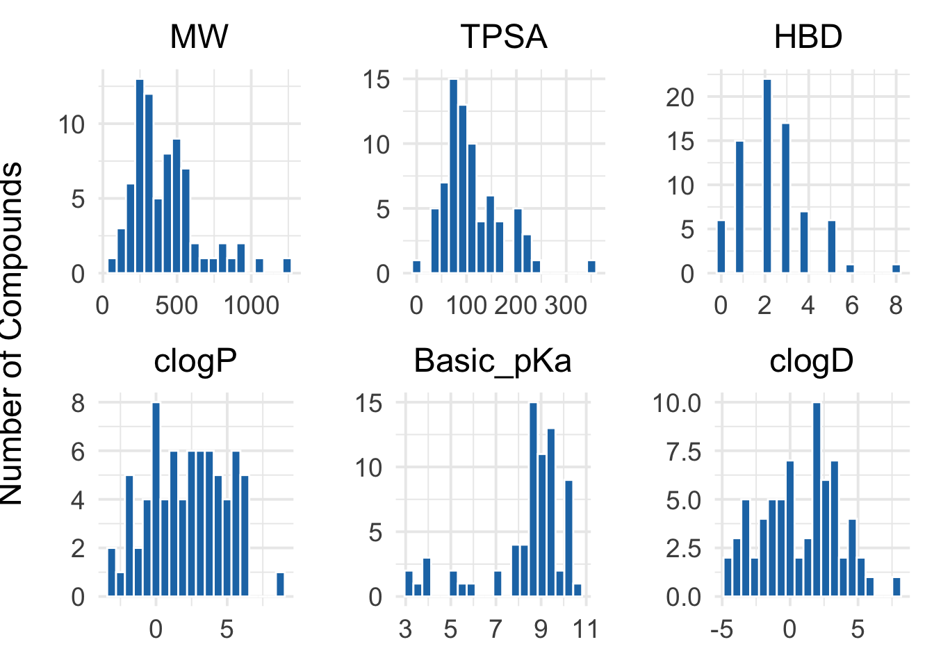 # Define the six descriptorsdescriptors <-c("MW", "TPSA", "HBD", "clogP", "Basic_pKa", "clogD")# Function to generate a consistent histogram plotplot_descriptor <-function(df, column) {ggplot(df, aes_string(x = column)) +geom_histogram(bins =20, fill ="#1f77b4", color ="white") +theme_minimal(base_size =15) +labs(title = column, x =NULL, y ="") +theme(plot.title =element_text(hjust =0.5),axis.text =element_text(size =14) )}# Create individual plots as beforeplots <-lapply(descriptors, function(col) plot_descriptor(merged_df, col))# Combine them into a 2x3 patchworkdescriptors_histograms <- (plots[[1]] | plots[[2]] | plots[[3]]) / (plots[[4]] | plots[[5]] | plots[[6]]) +plot_annotation(theme =theme(plot.title =element_text(size =18, face ="bold", hjust =0.5)))# Add global y-label using cowplot::ggdrawdescriptors_plot <-ggdraw(descriptors_histograms) +draw_label("Number of Compounds", x =0.01, y =0.5, angle =90, vjust =0.5, fontface ="plain", size =18)# Show plotprint(descriptors_plot)