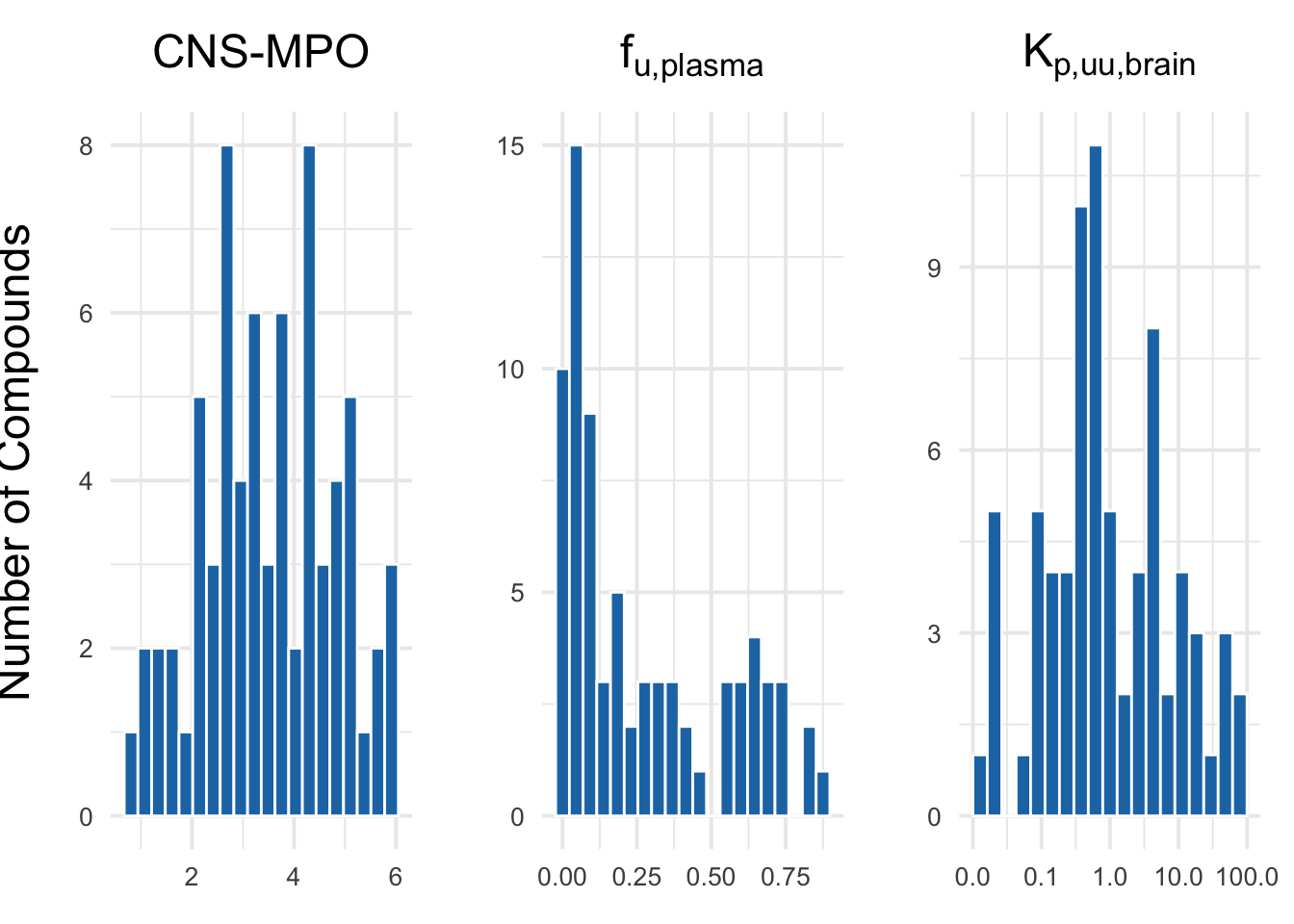 # Define column names and custom titlescols <-c("CNS_MPO", "predicted_Fu", "kp_uu_brain")titles <-list(expression("CNS-MPO"),expression(f[u*","*plain("plasma")]),expression(K[p*","*plain("uu")*","*plain("brain")]))# Function to generate histogramsplot_hist <-function(data, col, title_expr) { p <-ggplot(data, aes_string(x = col)) +geom_histogram(bins =20, fill ="#1f77b4", color ="white") +theme_minimal(base_size =15) +labs(title = title_expr, x =NULL, y ="") +theme(plot.title =element_text(face ="bold", hjust =0.5),axis.text =element_text(size =10) )if (col =="kp_uu_brain") { p <- p +scale_x_log10(labels =label_number(accuracy =0.1)) }return(p)}# Create plotsplots <-mapply(function(col, title_expr) plot_hist(merged_df, col, title_expr), cols, titles, SIMPLIFY =FALSE)# Combine plots using patchworkpredictions_histograms <-wrap_plots(plots, ncol =3) +plot_annotation(theme =theme(plot.title =element_text(size =16, face ="bold", hjust =0.5)))# Add global y-axis label using cowplotpredictions_plot <-ggdraw(predictions_histograms) +draw_label("Number of Compounds", x =0.01, y =0.5, angle =90, vjust =0.5, size =18)# Show the final plotprint(predictions_plot)